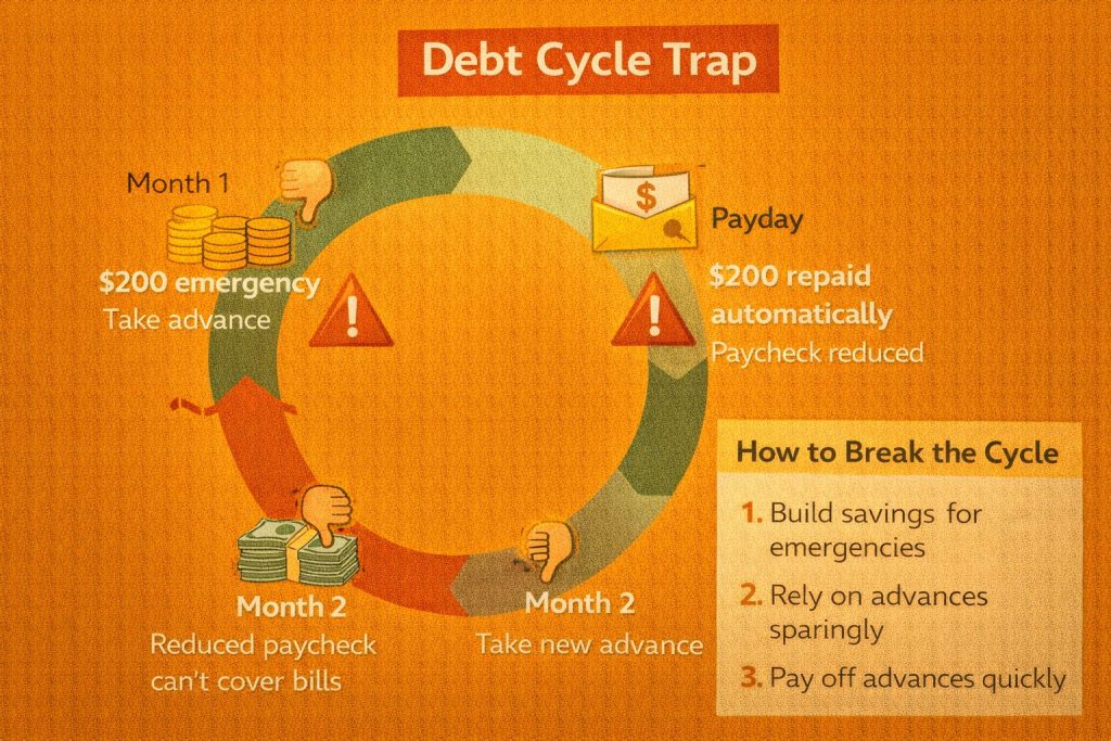 Breaking the cycle: Take an advance “holiday”—choose one pay period to absorb the full paycheck without taking a new advance, even if it means cutting discretionary spending to near-zero. Create a micro emergency fund of $50-$100 to handle small emergencies. Address whether income actually covers expenses—if it doesn’t, advances can’t solve that structural problem.